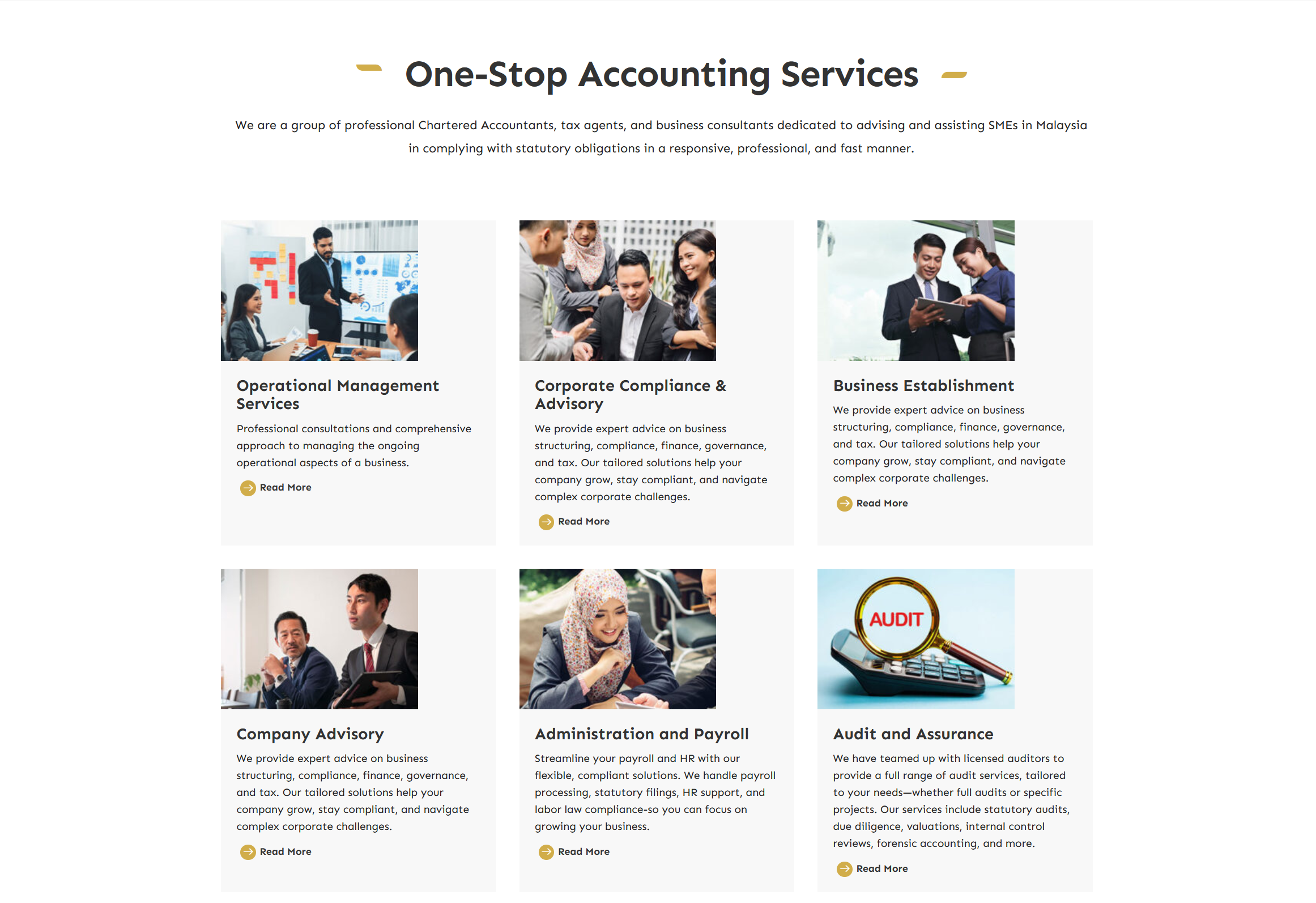 Service-Centric Navigation: Reorganized services into clear categories (e.g., Corporate Compliance, Accounting, Advisory, Audit) to improve discoverability and understanding.